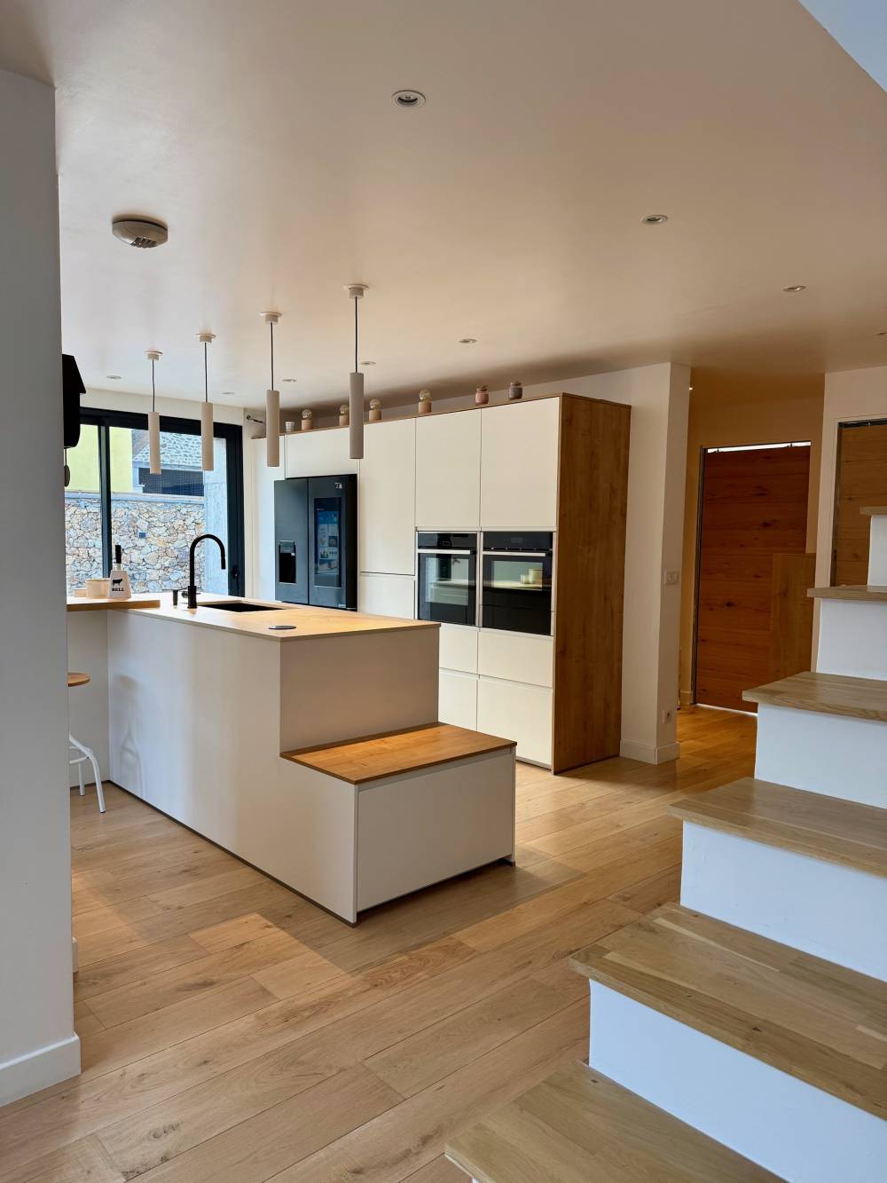 Son atout charme, c'est l'ouverture sur le salon avec son poêle à bois suspendu qui crée une atmosphère chaleureuse. Cette cuisine incarne l'alliance parfaite entre esthétisme, le confort et la praticité.